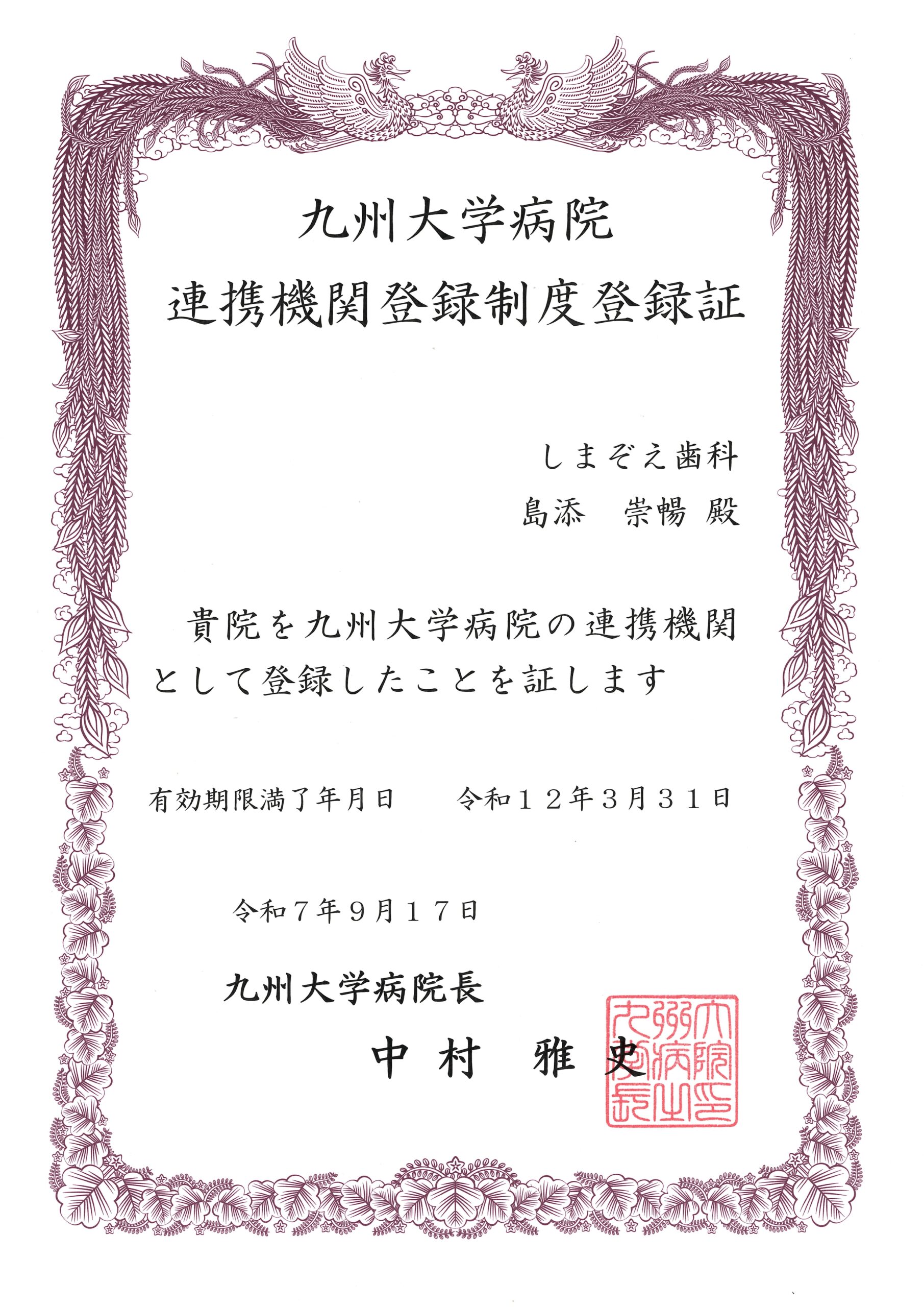 当院は診療体制において一定の基準を満たしている証として、九州大学病院の連携機関として登録されています。